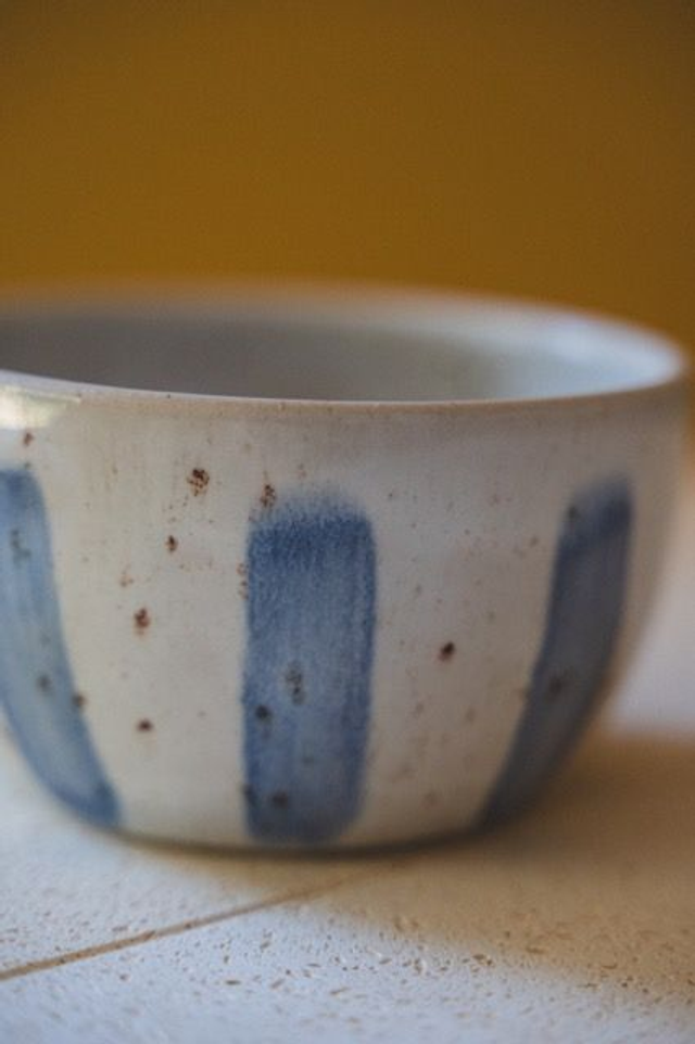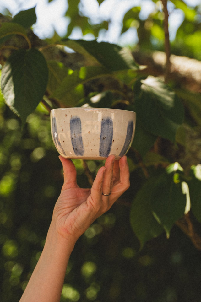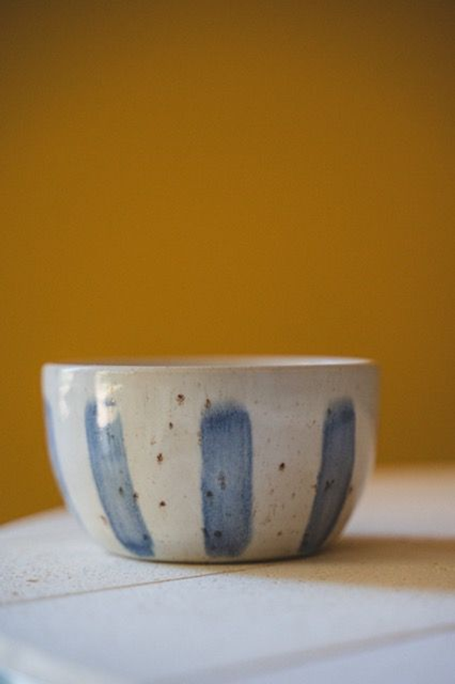 Bol blanc tacheté avec rayures bleu foncé 💙 Il accueillera parfaitement vos soupes, vos yaourts ou encore vos céréales du petit déjeuner ☕️